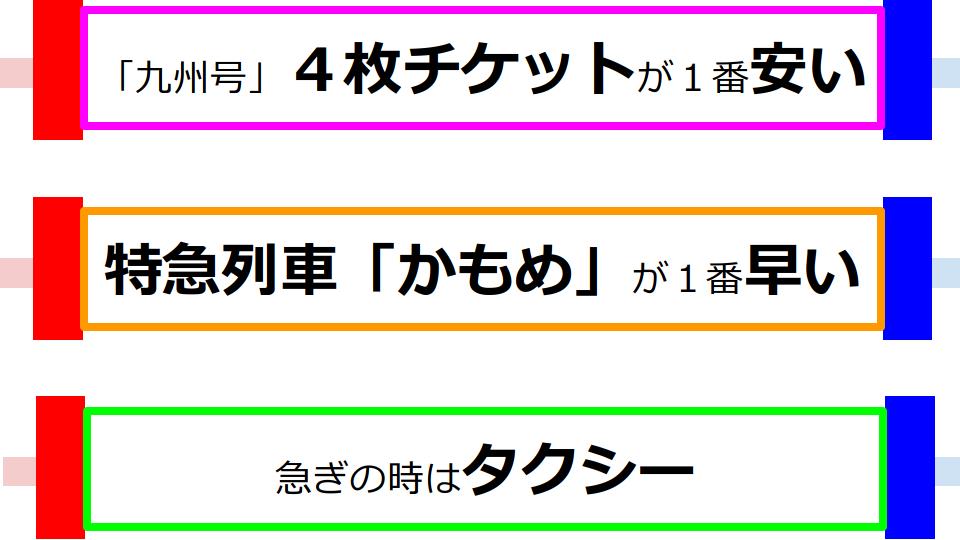 壱岐・対馬・五島へいくのであれば、飛行機や船をおススメしますが、長崎駅や博多駅周辺を目指すなら、上記の3つがおススメです。