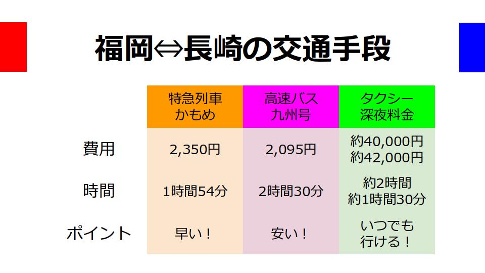 【福岡⇔長崎】の移動手段は大きく分けて3つあり、それぞれの特徴をまとめたのが下記の表になります。