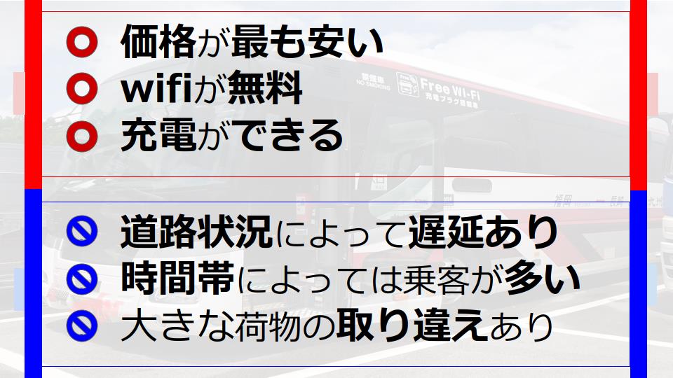 高速バスは安定した交通手段であり、かつ費用が安いという特徴があります。福岡⇔長崎間はトンネルが多く電波環境が悪くなりがちですが、高速バスだと常にWIFI環境下、しかも会員登録すれば1日何回でも無料で使用できるのが大きなポイントです。もちろんコンセントもついています。