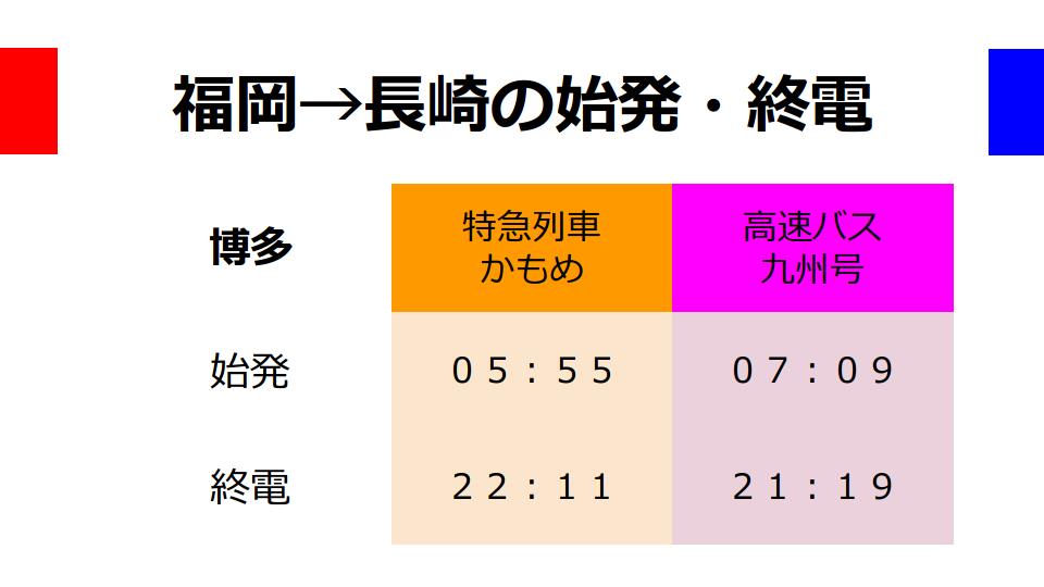 高速バス「九州号」の始発福岡発は07:09(平土日祝日)、始発長崎発は05:45(平土日祝日)。最終福岡発は21:19(平土日祝日)、最終長崎発は20:45(平土日祝日)。