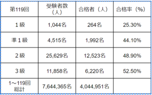 秘書検定は試験内容が毎年大幅に変わりません。つまり、開催年度によって合格率に大きな変動はありません。一例として第119回の結果をご紹介します。